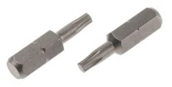 25 mm sześć bitów. Koronki do śrub z łbem walcowym rowkiem i śrubami z łbem gniazdowym Supadriv/Pozidrriv™, sześciokątnymi i TORX®. Wszystkie bity mają przekrój wałka sześciokątnego (1/4 in. w poprzek) z wycięciami, które umożliwiają ich zlokalizowanie i zablokowanie w odpowiednim narzędziu. Charakterystyka i zalety Koronki wykonane są z chromowanej stali wanadowej z szarymi, odpornymi na zarysowania wykończeniem 5 elementów - końcówki gwiazdkowe T-15 z torx do torby
