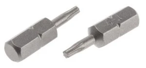 25 mm sześć bitów. Koronki do śrub z łbem walcowym rowkiem i śrubami z łbem gniazdowym Supadriv/Pozidrriv™, sześciokątnymi i TORX®. Wszystkie bity mają przekrój wałka sześciokątnego (1/4 in. w poprzek) z wycięciami, które umożliwiają ich zlokalizowanie i zablokowanie w odpowiednim narzędziu. Charakterystyka i zalety Koronki wykonane są z chromowanej stali wanadowej z szarymi, odpornymi na zarysowania wykończeniem 5 elementów - końcówki gwiazdkowe T-15 z torx do torby