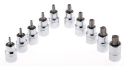 Zestawy sterowników TORX o długości 1/2cala z napędem kwadratowym. Utwardzony klucz Torx (lub gwiazdka) przystosowany do pracy w trudnych warunkach. Każdy zestaw jest dostarczany w całości na listwie przytrzymującej szyny, która może być zamontowana na ścianie lub używana w skrzynce narzędziowej szafy rolkowej. Chromowane gniazda wykonane ze stali Vanadium z użyciem koronek śrubokręta S2