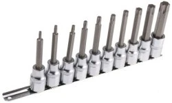 Zestawy sterowników TORX o długości 1/2cala z napędem kwadratowym. Utwardzony klucz Torx (lub gwiazdka) przystosowany do pracy w trudnych warunkach. Każdy zestaw jest dostarczany w całości na listwie przytrzymującej szyny, która może być zamontowana na ścianie lub używana w skrzynce narzędziowej szafy rolkowej. Chromowane gniazda wykonane ze stali Vanadium z użyciem koronek śrubokręta S2
