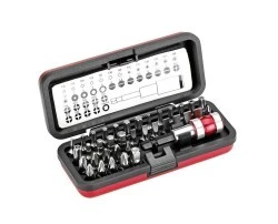 Zestaw kluczy nasadowych, 37-częściowy. W wytrzymałej aluminiowej walizce. Długość: 130 mm, waga: 320 g. Zawartość: uchwyt na bity z szybkozłączką, 65 mm, adapter 1/4'' do kluczy nasadowych, po jednym bicie 1/4'' o długości 25 mm: do wkrętów z rowkiem 4 - 4,5 - 5 - 5,5 - 6 - 6,5 - 7 mm, do wkrętów krzyżakowych PH 1 - PH 3, do wkrętów krzyżakowych PZ 1 - PZ 3, do gniazd sześciokątnych 3 - 4 - 5 - 6 mm, do wkrętów TORX* T10 - T15 - T20 - T25 - T27 - T30 - T40, do wkrętów TX z otworem antysabotażowym) T10 - T15 - T20 - T25 - T27 - T30 - T40, trzy końcówki po 1/4'', długość 25 mm: do wkrętów krzyżakowych PH2, do wkrętów krzyżakowych PZ2