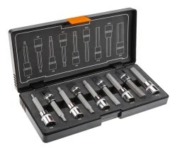 Zestaw końcówek sześciokątnych na nasadce 1/2"" NEO (nr ref. 08-706) składa się z 9 elementów (w rozmiarach od H4 do H17, o długości 100 mm). Nasadki wykonane są z wysokiej jakości stali chromowo-wanadowej. Wysoką trwałość końcówek wkrętakowych zapewnia zastosowanie stali S2. Całość dostarczona jest w praktycznej walizce. Jakość narzędzia potwierdzona certyfikatem TUV i 25-letnią gwarancją producenta. Marka NEO spełnia oczekiwania profesjonalistów.