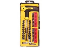 Końcówki wkrętakowe i nasadki z uchwytem, zestaw 4, 1/4 cala, uchwyt wkrętakowy typu T, 9 szt. nasadek sześciokątnych metrycznych, rozmiary: 4, 4.5, 5, 5.5, 6, 7, 8, 9, 10 mm, 9 sz. nasadek sześciokątnych metrycznych, rozmiary: 5, 32 cala, 3, 16 cala, 7, 32 cala, 1/4 cala, 9, 32 cala, 5, 16 cala, 11, 32 cala, 3/8 cala, 13, 32 cala, 19 szt. końcówek wkrętakowych, rozmiary: płaskie 3, 4, 4.5, 5, 5.5, 6, 7 mm, krzyżowe PH1, PH2, PH3, PZ1, PZ2, PZ3, Torx T20, T30, sześciokątne calowe H3, 32, H1, 8, H5, 32, H3, 16, adapter do końcówek wkrętakowych, adapter do nasadek, adapter do nasadek wygiety, stal CrV, końcówki wkrętakowe ze stali S2, walizka z etui