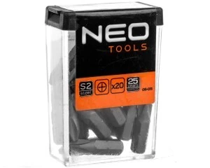 Końcówki wkrętakowe PH2 NEO (nr ref. 06-011) 1/4"", o długości 25 mm, 20 sztuk w zestawie. Dzięki zastosowaniu stali stopowej S2 twardość końcówek wynosi 60 HRC, co wydatnie wydłuża trwałość i jakość ich pracy. Wykonane zgodnie z normą DIN 3126. 25-letnia gwarancja producenta potwierdza wysoką jakość narzędzi. Marka NEO spełnia oczekiwania profesjonalistów.