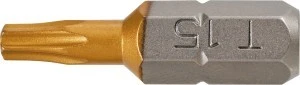 Końcówki wkrętakowe GRAPHITE (nr ref. 57H972) typu TX15 przeznaczone do wkręcania/wykręcania wkrętów i śrub z łbem typu Torx o rozmiarze 15 mm. Pokrycie powierzchni końcówek azotkiem tytanu (złoty kolor) znacząco przedłuża żywotność narzędzia poprzez utwardzenie punktu styku z łbem śruby.