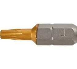 Końcówki wkrętakowe GRAPHITE (nr ref. 57H974) typu TX25, przeznaczone do wkręcania/wykręcania wkrętów i śrub z łbem typu Torx o rozmiarze 25 mm. Pokrycie powierzchni końcówek azotkiem tytanu (złoty kolor) znacząco przedłuża żywotność narzędzia poprzez utwardzenie punktu styku z łbem śruby.