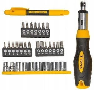 - Końcówki wkrętakowe: płaskie 3, 4, 5, 6, 7 mm, PH1, PH2, PH3, PZ1, PZ2, PZ3, T10, T15, T20, T30, H3, H4, H5, H6, H8
