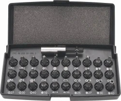 Końcówki wkrętakowe z uchwytem, zestaw 3, uchwyt 1/4 , 60 mm, magnetyczny, 30 szt. końcówek wkrętakowych 25 mm, stal S2, rozmiary: płaskie 3, 4, 5, 6 mm, krzyżowe PH1, 2 x PH2, PH3, PZ1, 2 x PZ2, PZ3, Torx T10, T15, T20, T25, T27, T30, T40, Torx z otworem TT10, TT15, TT20, TT25, TT27, TT30, T40, sześciokątne H3, H4, H5, H6, etui z tworzywa