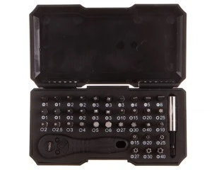 Końcówki wkrętakowe z uchwytem, zestaw 38 sztuk. Grzechotka do bitów 1/4 cala -48 zębów, uchwyt 1/4 cala -60mm, 36 sztuk końcówek wkretakowych 25mm stal S2 o rozmiarach: płaskie 3, 4, 5, 6 mm; krzyżowe 2x PH1, 2x PH2, 2x PH3, 2x PZ1, 2x PZ2, 2x PZ3; Torx T10, T15, T20, T25, T27, T30, T40; Torx z otworem TT10, TT15, TT20, TT25, TT27, TT30, TT40; sześciokątne H2, H2.5, H3, H4, H5, H6; etui z tworzywa; certyfikat TUV.