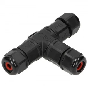 MINI konektor kablowy w formie trójnika ma bardzo małe rozmiary. Wysoki stopień szczelności IP68 zabezpiecza przed działaniem czynników zewnętrznych, a dodatkowe uszczelnienie uzyskamy po dokręceniu bloku łączeniowego O-ringiem. Materiał użyty do produkcji konektora jest odporny na działanie promieni UV i nadaje się do stosowania na zewnątrz. Styki zostały wykonane z mosiądzu, dodatkowo zabezpieczonego przed utlenianiem warstwą niklu. Dławica wyposażona została w grubą uszczelkę, która dokładnie uszczelnia wprowadzone przewody.