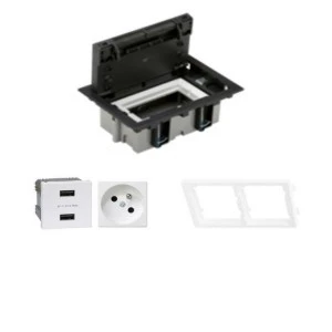 Floor box (puszka podłogowa) z osprzętem do podłóg technicznych (podniesionych). Puszka podłogowa (floor box) - jest to kompletny zestaw składający się z: 1 x puszka podłogowa 2-krotna SF170/14 standardu CIMA (głębokość - 70-105mm) 1 x adapter poziomy CIMA do modułów K45 S66/9 1 x gniazdo pojedyncze K45 z/u białe K02/9 1 x gniazdo USB ładowania 5V K126E/9