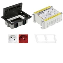 Floor box (puszka podłogowa) z osprzętem do montażu w podłogach wylewanych. Puszka podłogowa (floor box) - jest to kompletny zestaw składający się z: 1 x puszka podłogowa 2-krotna SF170/14 standardu CIMA (głębokość - 70-105mm) 1 x kaseta do montażu w podłogach wylewanych G11 1 x adapter poziomy CIMA do modułów K45 S66/9 1 x gniazdo pojedyncze K45 z/u białe K02/9 1 x gniazdo pojedyncze K45 z/u czerwone KS22/6