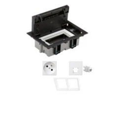 Floor box (puszka podłogowa) z osprzętem do podłóg technicznych (podniesionych). Puszka podłogowa (floor box) - jest to kompletny zestaw składający się z: 1 x puszka podłogowa 2-krotna SF170/14 standardu CIMA (głębokość - 70-105mm) 1 x adapter poziomy CIMA do modułów K45 S66/9 1 x gniazdo pojedyncze K45 z/u białe K02/9 1 x płytka gniazda teleinformatycznego pojedynczego K45 K076/9 1 x wkład gniazda pojedynczego RJ45 kat. 6 nieekranowany biały MRJ456