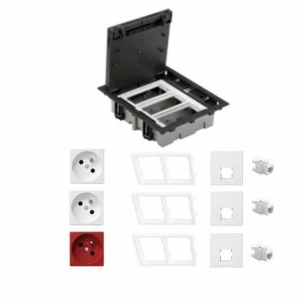 Floor box (puszka podłogowa) z osprzętem do podłóg technicznych (podniesionych). Puszka podłogowa (floor box) - jest to kompletny zestaw składający się z: 1 x puszka podłogowa 6-krotna SF370/14 standardu CIMA (głębokość - 70-105mm) 3 x adapter poziomy CIMA do modułów K45 S66/9 2 x gniazdo pojedyncze K45 z/u białe K02/9 1 x gniazdo pojedyncze K45 z/u czerwone KS22/6 3 x płytka gniazda teleinformatycznego pojedynczego K45 K076/9 3 x wkład gniazda pojedynczego RJ45 kat. 6 nieekranowany biały MRJ456