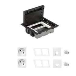 Floor box (puszka podłogowa) z osprzętem do podłóg technicznych (podniesionych). Puszka podłogowa (floor box) - jest to kompletny zestaw składający się z: 1 x puszka podłogowa 4-krotna SF270/14 standardu CIMA (głębokość - 70-105mm) 2 x adapter poziomy CIMA do modułów K45 S66/9 2 x gniazdo pojedyncze K45 z/u białe K02/9 2 x płytka gniazda teleinformatycznego pojedynczego K45 K076/9 2 x wkład gniazda pojedynczego RJ45 kat. 6 nieekranowany biały MRJ456