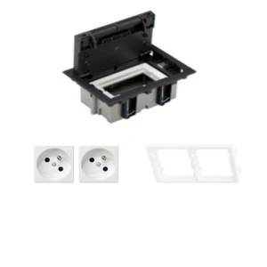 Floor box (puszka podłogowa) z osprzętem do podłóg technicznych (podniesionych). Puszka podłogowa (floor box) - jest to kompletny zestaw składający się z: 1 x puszka podłogowa 2-krotna SF170/14 standardu CIMA (głębokość - 70-105mm) 1 x adapter poziomy CIMA do modułów K45 S66/9 2 x gniazdo pojedyncze K45 z/u białe K02/9