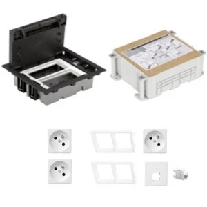 Floor box (puszka podłogowa) z osprzętem do montażu w podłogach wylewanych. Puszka podłogowa (floor box) - jest to kompletny zestaw składający się z: 1 x puszka podłogowa 4-krotna SF270/14 standardu CIMA (głębokość - 70-105mm) 1 x kaseta do montażu w podłogach wylewanych G22 2 x adapter poziomy CIMA do modułów K45 S66/9 3 x gniazdo pojedyncze K45 z/u białe K02/9 1 x płytka gniazda teleinformatycznego pojedynczego K45 K076/9 1 x wkład gniazda pojedynczego RJ45 kat. 6 nieekranowany biały MRJ456