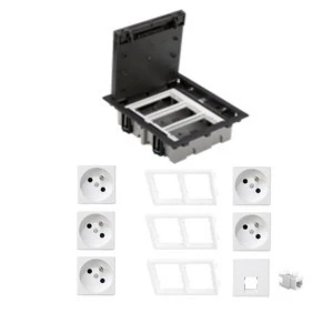 Floor box (puszka podłogowa) z osprzętem do podłóg technicznych (podniesionych). Puszka podłogowa (floor box) - jest to kompletny zestaw składający się z: 1 x puszka podłogowa 6-krotna SF370/14 standardu CIMA (głębokość - 70-105mm) 3 x adapter poziomy CIMA do modułów K45 S66/9 5 x gniazdo pojedyncze K45 z/u białe K02/9 1 x płytka gniazda teleinformatycznego pojedynczego K45 K076/9 1 x wkład gniazda pojedynczego RJ45 kat. 6 nieekranowany biały MRJ456