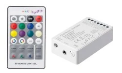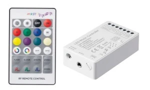 Kontroler AUDIO współpracuje z taśmami RGB jak również RGBW o łącznej mocy 180W. Jest to urządzenie radiowe. Sterowanie odbywa się za pomocą pilota z 24 przyciskami.