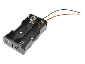 Koszyk na dwie baterie AA LR6. Przewody są wyprowadzone i przygotowane do lutowania.