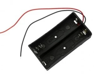 Koszyk na dwa akumulatorki typu 18650. Od pojemnika odchodzą przewody, przygotowane do dowolnego lutowania.