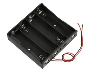 Koszyk na cztery akumulatorki typu 18650. Od pojemnika odchodzą przewody, przygotowane do dowolnego lutowania.