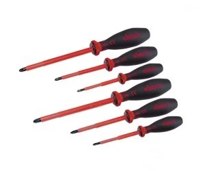 Zestaw wkrętaków krzyżakowych 1.000 VDE, 6-częściowy; izolowany, zgodny z IEC 60900, klasyfikacja VDE 0682, część 201, testowany w kąpieli wodnej napięciem testowym 10.000 V. Wersja: PH1x80 mm (art. nr 117731), PH2x100 mm (art. nr 117732), PH3x150 mm (art. nr 117733), PZ1x80 mm (art. nr 117741), PZ2x100 mm (art. nr 117742), PZ3x150 mm (art. nr 117743)