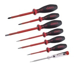Zestaw wkrętaków dla elektryków VDE, 7-częściowy, do wkrętów z rowkiem. Wymiary: 2,5x 0,4x75 mm (artykuł CIMCO nr 11 7701), 3,0x0,5x100 (artykuł CIMCO nr 11 702), 4,0x0,8x100 mm (artykuł CIMCO nr 11 7704), 5,5x1,0x125 mm (artykuł CIMCO nr 11 7705). 7704), 5,5x1,0x125 mm (CIMCO nr artykułu 11 7705); wkrętak krzyżakowy VDE: PZ1x80 mm (CIMCO nr artykułu 11 7741), PZ2x100 (CIMCO nr artykułu 11 7742;) tester fazy VDE (250 V AC)