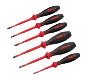 Wąskie wkrętaki VDE z izolacją 1000 V, z wąskim grotem zapewniającym optymalny dostęp do głęboko osadzonych wkrętów. Zgodnie z normą IEC 60900, klasyfikacja VDE 0682, część 201, testowane w kąpieli wodnej napięciem testowym 10 000 V. Testowane przez GS. Ergonomiczny trójkątny kształt rękojeści, odporny na benzynę, rozcieńczalniki i inne rozpuszczalniki chemiczne. Wkrętak VDE-SLIM-TX 6-częściowy; wymiary: T10x60 mm; T15x75 mm; T20x100 mm; T25x100 mm; wkrętak specjalny VDE z profilem kombinowanym. Wymiary: PZ FL 1x80 mm; PZ FL 2x100 mm