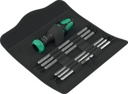 1 rękojeść z uchwytem do trzpieni wymiennych Vario 80 RA z funkcją grzechotki. Drobnozębna grzechotka zintegrowana z rękojeścią zapewnia szybką pracę. Intuicyjna zmiana kierunku pracy: obrót pierścienia przełączającego w prawo powoduje zmianę kierunku pracy w prawo, obrót pierścienia przełączającego w lewo powoduje zmianę kierunku pracy w lewo. Mechanizm zapadkowy można zablokować w pozycji 0 dla zapewnienia precyzyjnej pracy; gniazdo sześciokątne do dwustronnych trzpieni Vario firmy Wera. 6 dwustronnych trzpieni Vario (12 różnych wielkości) W składanym, wytrzymałym etui.