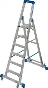 - Drabina z podestem wyposażona w dwa stabilizatory z samoblokującymi się rolkami jezdnymi zapewniające stabilność i mobilność