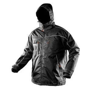 Powyższy model kurtki został zaprojektowany oraz wyprodukowany przez specjalistów współpracujących z koncernem TOPEX. Ten model ma długie rękawy, wysoki kołnierz oraz kaptur, który można odpiąć. Ten model został zaprojektowany tak, aby skutecznie chronić przed szkodliwymi warunkami atmosferycznymi. Kurtkę zrobiono bowiem z najwyższej jakości starannie wyselekcjonowanego tworzywa sztucznego. Jest to stuprocentowy poliester. Ten materiał ma kolor ciemnej szarości. Ma również wstawki w białym, kontrastującym kolorze. Materiał jest wyjątkowo praktyczny. Doskonale bowiem zabezpiecza przed wodą oraz przed wiatrem. Dany tutaj model kurtki jest dostępny w rozmiarze XXL.