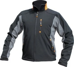 Kurtka softshell, rozmiar XXL/58, wodoodporność 5000 mm, oddychalność 3000 g/m2/24h, wiatrochronna, mankiet na kciuk, polarowa strona wewnętrzna, kieszeń na telefon, ściągacz w dolnym szwie