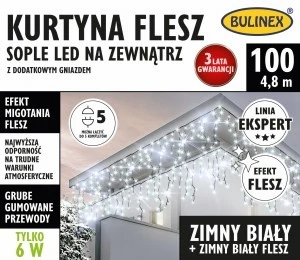 Kurtyna świetlna zewnętrzna Flesz 100 LED w formie sopli to stylowe i nowoczesne rozwiązanie, idealne do dekoracji przestrzeni na świeżym powietrzu. Dzięki efektownemu designowi, tworzy magiczną i przytulną atmosferę każdego otoczenia.