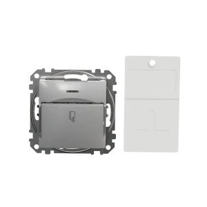 Łącznik hotelowy, srebrne aluminium, to osprzęt serii Sedna Design & Elements marki Schneider Electric. Łącznik hotelowy ma malowane wykończenie powierzchni w kolorze srebrnego aluminium i posiada następujące wymiary: szerokość 73 mm, wysokość 73 mm, głębokość 42 mm, gł ębokość wystawania 24 mm. Długość izolacji zdejmowanej z kabla to 13 mm. Łącznik charakteryzuje się stopniem ochrony IP20 i zakresem mocy wynoszącym 2300 W. Do produkcji łącznika wykorzystano tworzywo termoplastyczne o zwiększonej odporności na promieniowanie UV. Produk t jest montowany podtynkowo i posiada zaciski bezśrubowe. Uwaga: produkty Sedna Design & Elements nie są kompatybilne z serią Sedna!