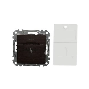 Łącznik hotelowy, wenge, efekt drewna, to osprzęt serii Sedna Design & Elements marki Schneider Electric. Łącznik hotelowy ma satynowe wykończenie powierzchni w kolorze wenge i posiada następujące wymiary: szerokość 73 mm, wysokość 73 mm, głębokość 42 mm, głębokość wystawania 24 mm. Długość izolacji zdejmowanej z kabla to 13 mm. Łącznik charakteryzuje się stopniem ochrony IP20 i zakresem mocy wynoszącym 2300 W. Do produkcji łącznika wykorzystano tworzywo termoplastyczne o zwiększonej odporności na promieniowanie UV, które doskonale imituje naturalne materiały. Produkt jest montowany podtynkowo i posiada zaciski bezśrubowe. Uwaga: produkty Sedna Design & Elements nie są kompatybilne z serią Sedna!