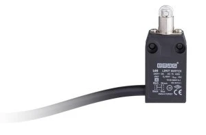 Łącznik krańcowy z przewodem, w obudowie z tworzywa, wyposażony w popychacz z metalową rolką, 1NC+1NO.