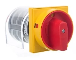 Z ŻÓŁTO/CZERWONYM POKRĘTŁEM BLOKOWANYM W POZYCJI 0, Z OSŁONAMI ZACISKÓW I TABLICZKĄ 65X65MM