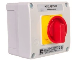 Łącznik krzywkowy 10A rozłącznik 0‑1 4P w obudowie OB11 z czołem zamykanym żółto/czerwonym SK10‑2.8210\OB11ZC
