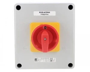 Łącznik krzywkowy 63A rozłącznik 0‑1 (4 ‑ biegunowy)w obudowie OB16 z czołem zamykanym żółto/czerwonym SK63‑2.8210\OB16ZC