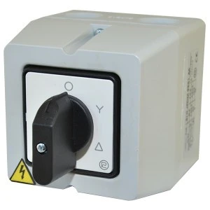 Łącznik krzywkowy, przełącznik rozruchowy GWIAZDA-TRÓJKĄT, w obudowie z tworzywa, z płytą czołową i tabliczką.