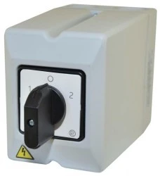 Łącznik krzywkowy rewersyjny, przełącznik kierunków LEWO-PRAWO, w obudowie z tworzywa, z płytą czołową i tabliczką.