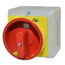 Łącznik typu ZAŁĄCZ-WYŁĄCZ, w obudowie z tworzywa, z możliwością zamknięcia na trzy kłódki (Ø5-8 mm).