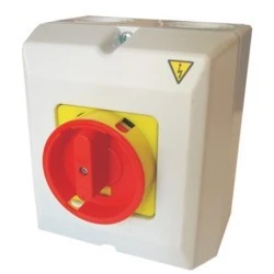 Łącznik typu ZAŁĄCZ-WYŁĄCZ, w obudowie z tworzywa, z możliwością zamknięcia na trzy kłódki (Ø5-8 mm).