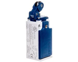 Łącznik w obudowie z tworzywa, 1NC+1NO. Rodzaj napędu – popychacz z dźwignią poziomą z rolką metalową, działanie jednokierunkowe.