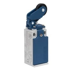 Łącznik w obudowie z tworzywa, 1NC+1NO. Rodzaj napędu – popychacz z dźwignią poziomą z rolką z tworzywa (fi22), działanie jednokierunkowe.
