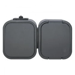 Podwójny osprzęt, w którego skład wchodzą zintegrowany łącznik jednobiegunowy oraz gniazdo typu francuskiego z klapką 2P+Z. Jest to wygodne rozwiązanie dla niewielkich powierzchni. Sprawdzi się wszędzie tam, gdzie konieczna jest ochrona przed kurzem i strugami wody (IP54).