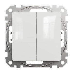 Łącznik podwójny schodowy, biały, to osprzęt serii Sedna Design & Elements marki Schneider Electric. Łącznik podwójny schodowy ma lśniące wykończenie powierzchni w kolorze białym i posiada następujące wymiary: szerokość 73 mm, wysokość 73 mm, głębokość 37 mm, głębokość wystawania 24 mm. Długość izolacji zdejmowanej z kabla to 13 mm. Łącznik charakteryzuje się stopniem ochrony IP20 i zakresem mocy wynoszącym 2300 W. Do produkcji łącznika wykorzystano tworzywo termoplastyczne o zwiększonej odporności na promieniowanie UV. Produkt jest montowany podtynkowo i posiada zaciski śrubowe. Uwaga: produkty Sedna Design & Elements nie są kompatybilne z serią Sedna!