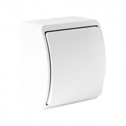 Łącznik natynkowy pojedynczy biały IP44 napięcie znamionowe 250V~ prąd znamionowy 10A montaż natynkowy sposób mocowania zaciski śrubowe kolor gniazda/klapki biały/biały wykończenie powierzchni matowa stopień ochrony IP44 materiał ABS wymiary 74x62x46mm normy i aprobaty CE producent Doktorvolt numer artykułu 151-01-DRV EAN 5906365205706