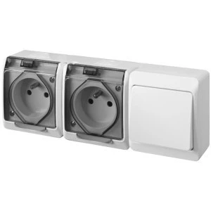 Łącznik schodowy pojedynczy natynkowy + gniazdo 2x 2p+Z Schuko bryzgoszczelny IP44 biały HERMES ELEKTRO‑PLAST NASIELSK